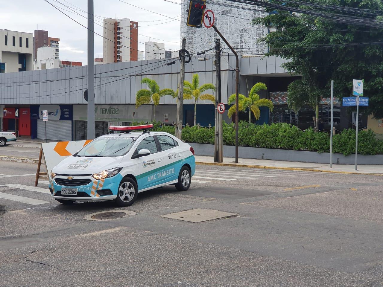A Avenida Desembargador Moreira teve o trecho interditado prolongado entre a Rua Torres Câmara e a Praça Portugal, no sentido praia/sertão, a partir desta sexta-feira (26). O trecho entre a praça e a Av. Santos Dumont já estava bloqueado.