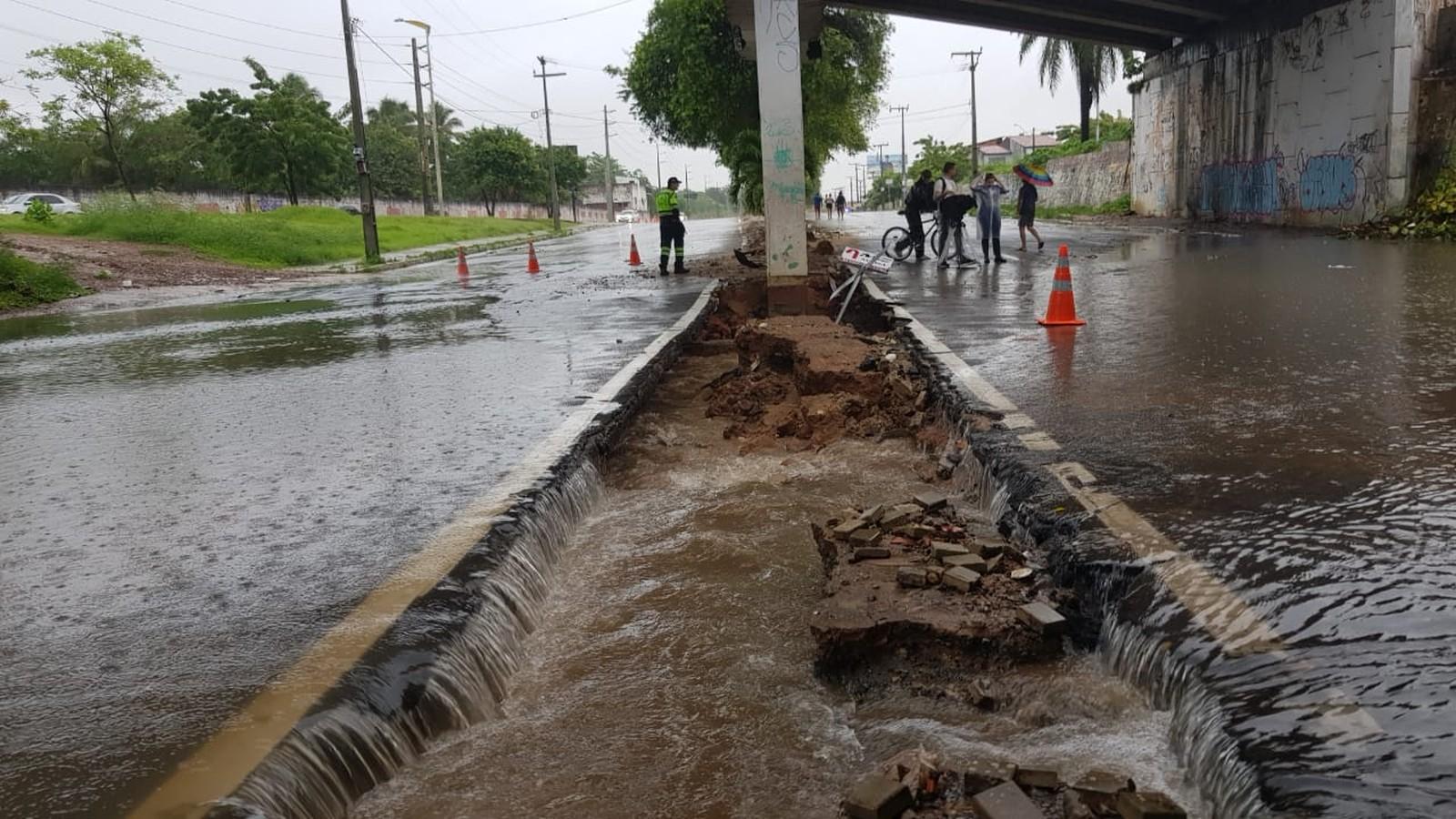 Há concentração de água no canteiro da via e o chão cedeu