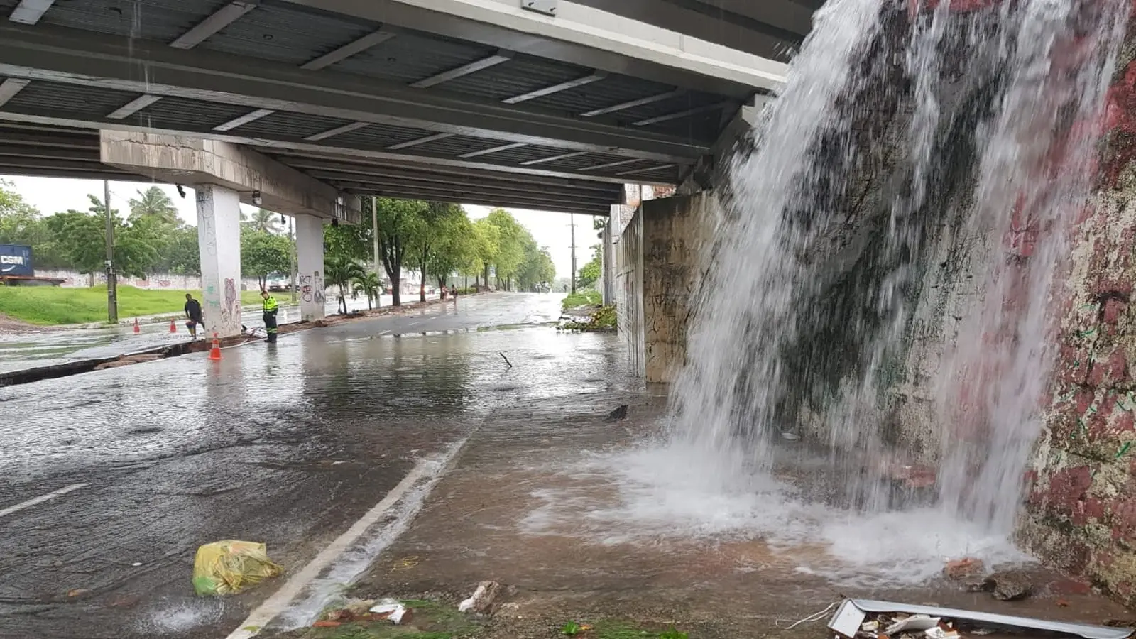 A água que jorra de ruas do Bairro São João do Tauape por uma encosta formou uma cachoeira no viaduto.