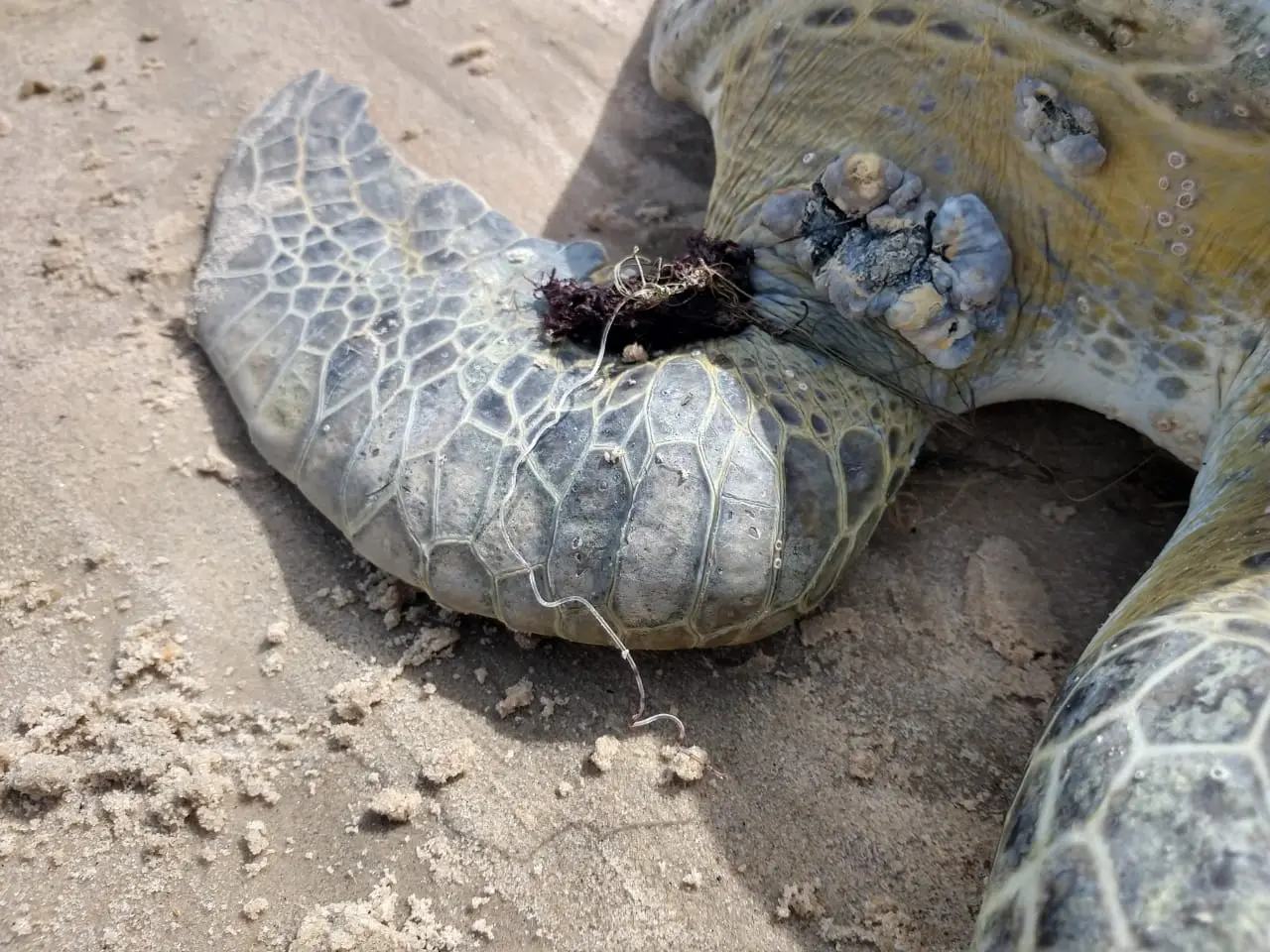 A nadadeira dianteira do animal estava presa por um fio