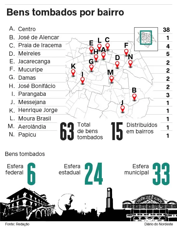 Ao todo, Fortaleza tem 65 bens tombados pelos três níveis de governo – municipal, estadual ou federal – distribuídos em 14 bairros. Outros 54 bens estão tombados provisoriamente pela esfera municipal – única atualmente com processos de tombamento em análise em Fortaleza.