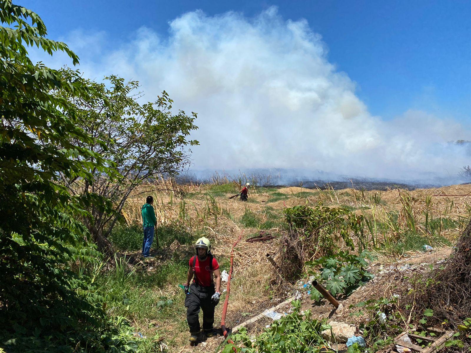 As equipes fazem “raspagem” da área da vegetação de forma que haja uma zona de isolamento entre o capinzal incendiado e as demais vegetações do Parque