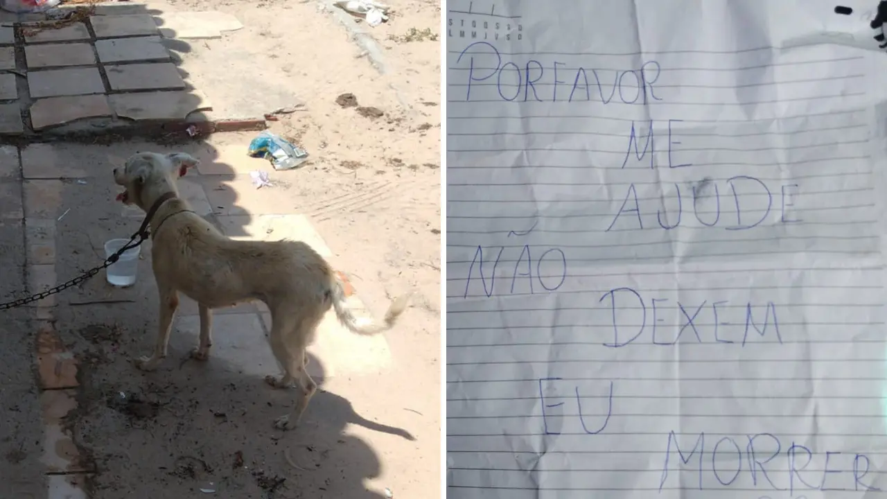Uma cadela foi resgatada, nesta sexta-feira (22), por agentes da Guarda Municipal de Aquiraz, na Região Metropolitana de Fortaleza. O animal, que estava visivelmente desnutrido e amarrado a uma árvore em uma calçada, carregava um bilhete com o seguinte apelo: "Por favor, me ajude, não deixem eu morrer".