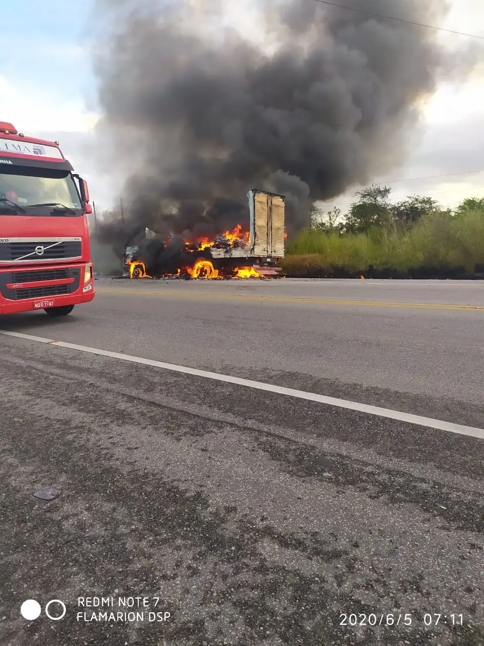 A composição do Corpo de Bombeiros atendeu à ocorrência e controlou as chamas, por volta de 7h. De acordo com os Bombeiros, testemunhas afirmaram que o fogo começou na carroceria do caminhão.