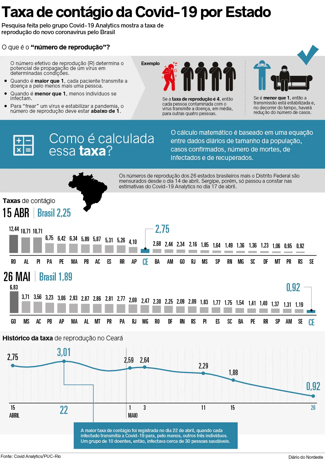 O levantamento da PUC-Rio mostra as taxas de contaminação no Ceará entre os dias 15 de abril, quando uma pessoa infectada no Estado transmitia a doença para outras 2,75; e 26 de maio, segundo dia em que a taxa ficou abaixo de 1, considerado o "ideal". O número favorável foi atingido ainda em 25 de maio, quando ficou em 0,99. A taxa atual do Brasil, de 26 de maio, é de 1,89.