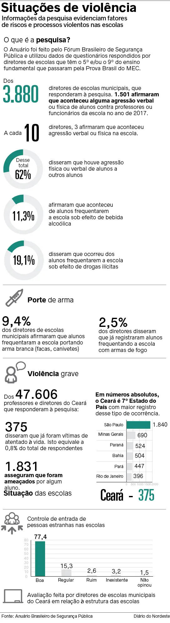Essa é a segunda vez que o Anuário Brasileiro de Segurança Pública traz dados sobre violência nas escolas. O levantamento agrega informações geradas na Prova Brasil, realizada a cada 2 anos. Na edição do Anuário de 2017 com dados referentes a 2016, 255 professores do Ceará afirmaram terem sofrido atentado à vida.