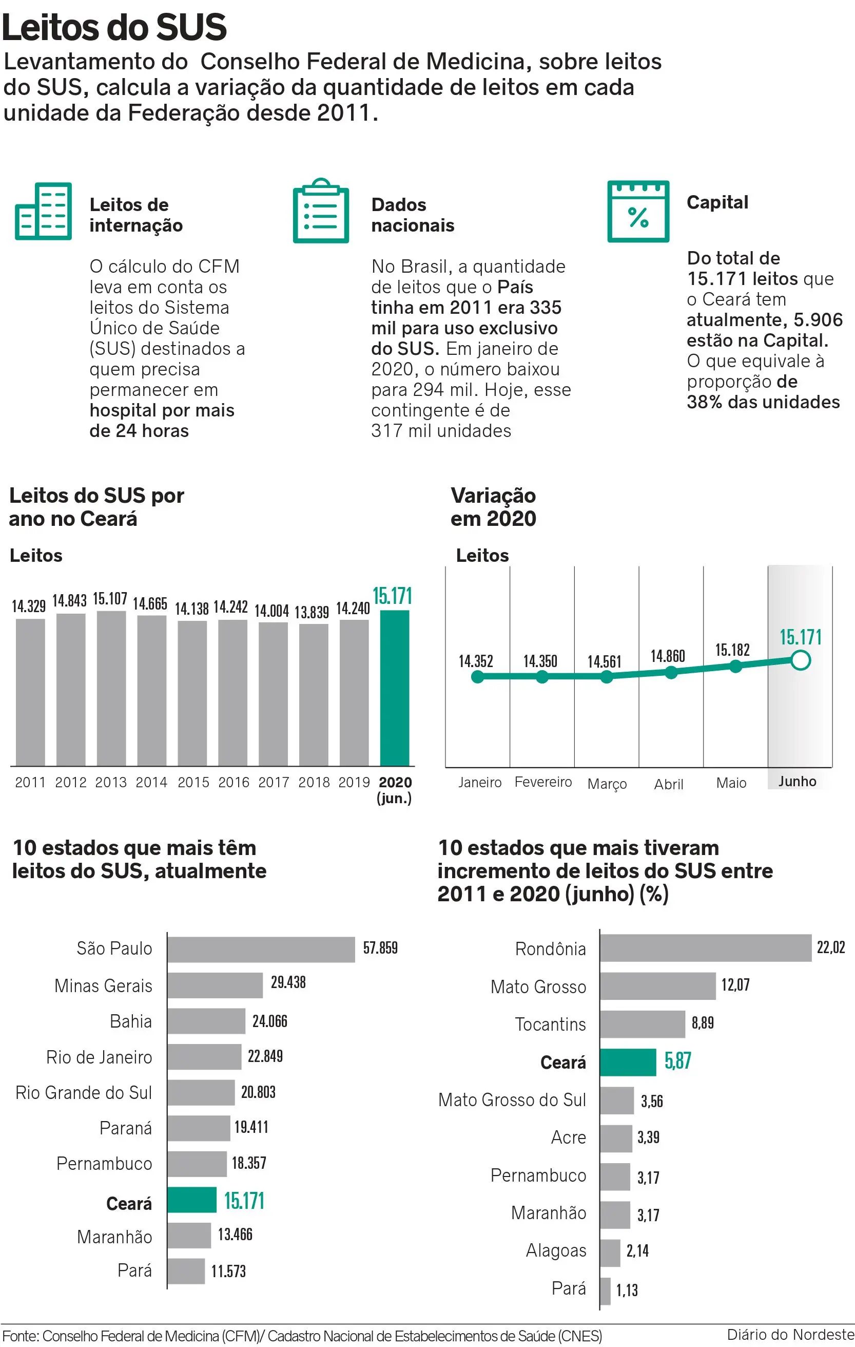 No Brasil, apenas Rondônia, Mato Grosso e Tocantins tiveram aumento proporcional maior que o do Ceará. No Estado, diferentemente de outras unidades da federação, no início de 2020, o número de leitos habilitados para funcionar pelo SUS era superior à quantidade de estruturas do tipo disponíveis em 2011. Na maioria dos outros estados, esse total vinha em queda gradual.