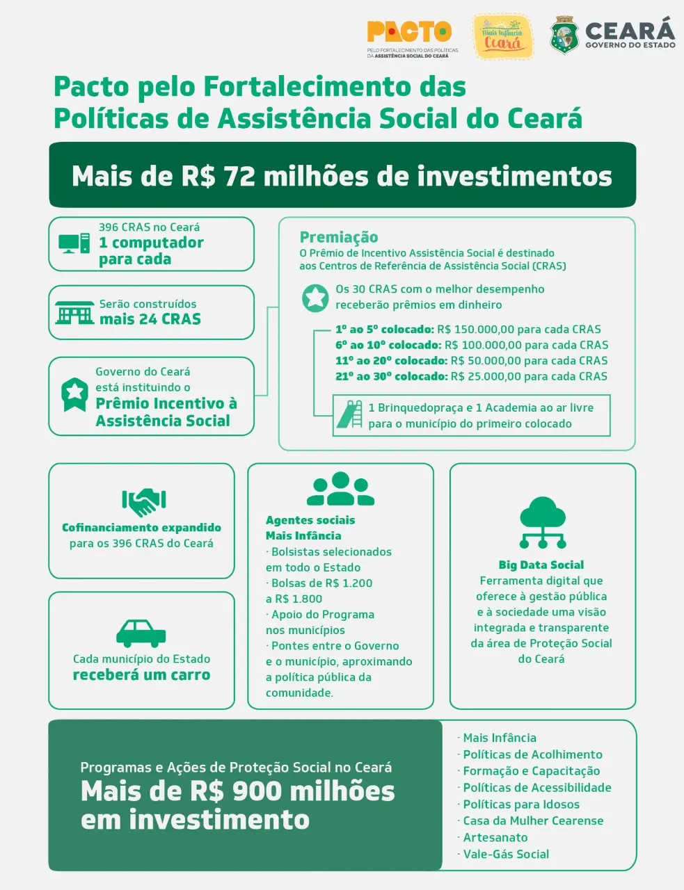 O Governo do Ceará já tem mais de R$ 900 milhões investidos em programas e ações de proteção social. Com o pacto, serão, inicialmente, mais R$ 72 milhões.