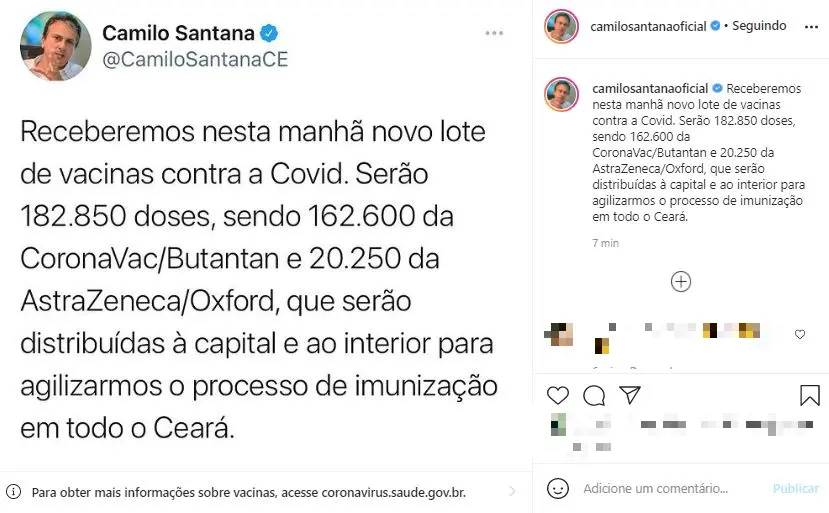 Mais cedo, ao anunciar a chegada das doses, Camilo Santana informou que esse novo lote será usado para aplicação da primeira dose