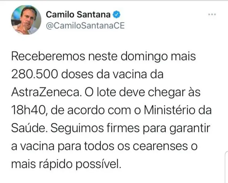 De acordo com o chefe do Executivo estadual, baseado nas informações do Ministério da Saúde, o novo lote deve chegar às 18h40. 'Seguimos firmes para garantir a vacina para todos os cearenses o mais rápido possível", escreveu.