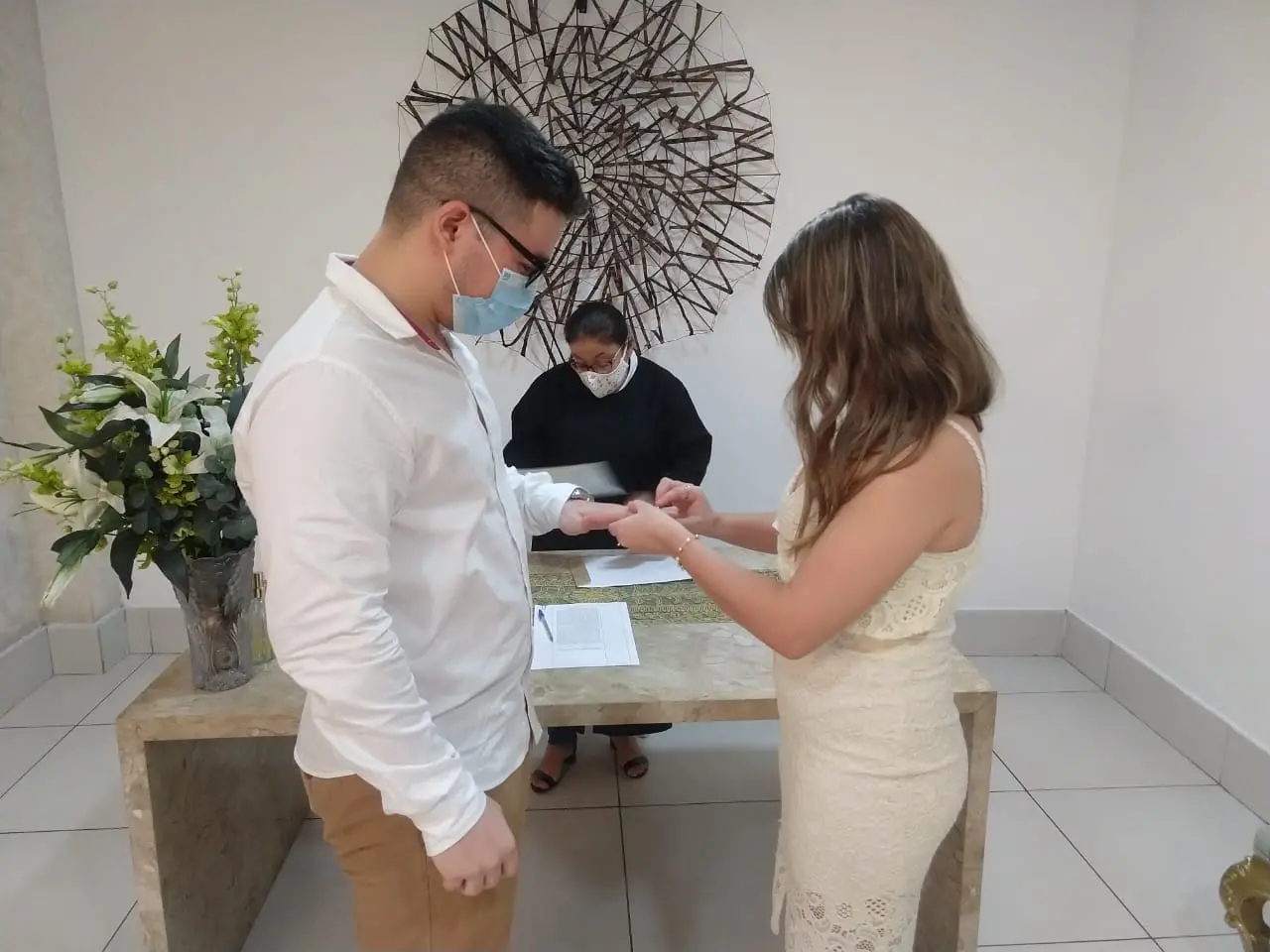 A partir da ligação, a cerimônia improvisada ganhou contorno. Por causa das recomendações sanitárias, a família não pode estar presente para ajudar o casal nos preparativos. “A gente resolveu fazer um almoço aqui, né? Não dava para fazer quase nada que a gente tinha pensado, não dava para juntar as famílias. Mas aí nós fomos com as testemunhas para o cartório, com muito álcool gel”