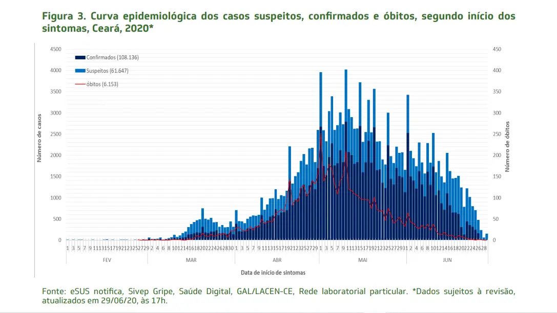 Os dados foram apresentados através do Boletim Epidemiológico da Covid-19, publicado nesta quinta-feira (2) pela Sesa. De acordo com a Pasta, os casos confirmados acompanham a curva dos casos suspeitos, e, na maioria dos casos que evoluíram para a morte dos pacientes, os sintomas começaram entre os dias 28 de abril e 10 de maio, com pico no dia 1º de maio.
