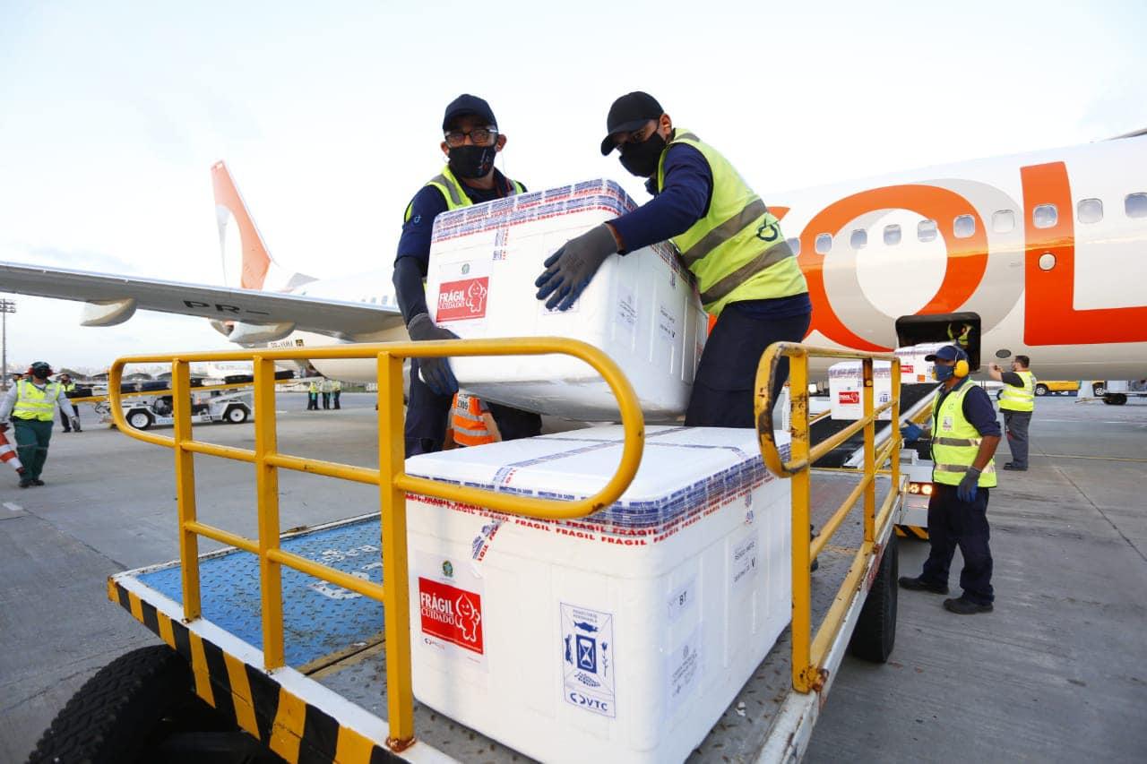 Desembarcaram no fim da tarde desta quinta-feira (1º), no Aeroporto de Fortaleza, 371.750 doses de vacina contra a Covid-19. Este é maior lote entregue ao Ceará desde o início do cronograma de imunização.