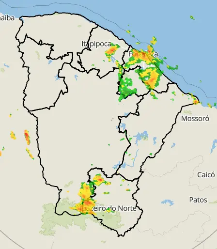 Imagens do Radar Meteorológico do órgão registado às 7h mostram uma forte concentração de nuvens sobre a Capital e também boa parte da região do Cariri. Veja abaixo: