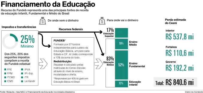 A Associação dos Municípios do Estado do Ceará (Aprece) diz que o Fundo de Manutenção e Desenvolvimento da Educação Básica e de valorização dos profissionais da educação (Fundeb) vem em queda no Estado desde 2013 e, com a pandemia, em 2020, pode perder até R$ 840 milhões. Ou seja, esse valor deixará de ser aplicado no custeio e no desenvolvimento das redes públicas de ensino no Estado.