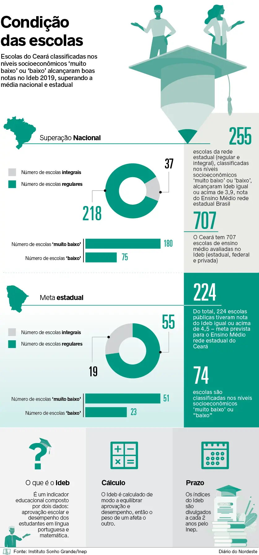 Ter boa condição financeira e, por isso, ser um aluno com desempenho superior aos estudantes de escolas de áreas pobres. Embora essa relação pareça previsível sob determinados aspectos, na educação ela nem sempre se comprova. No Ceará, em 2019, 224 escolas públicas tiveram nota no Índice de Desenvolvimento da Educação Básica (Ideb) igual ou acima de 4,5. Essa é a meta estabelecida para o Ensino Médio da rede estadual. Destas, 74 são escolas localizadas em áreas pobres, pois, conforme classificação do Instituto Nacional de Estudos e Pesquisas Educacionais Anísio Teixeira (Inep), têm alunos cujos níveis socioeconômicos são 'muito baixo' ou 'baixo'.