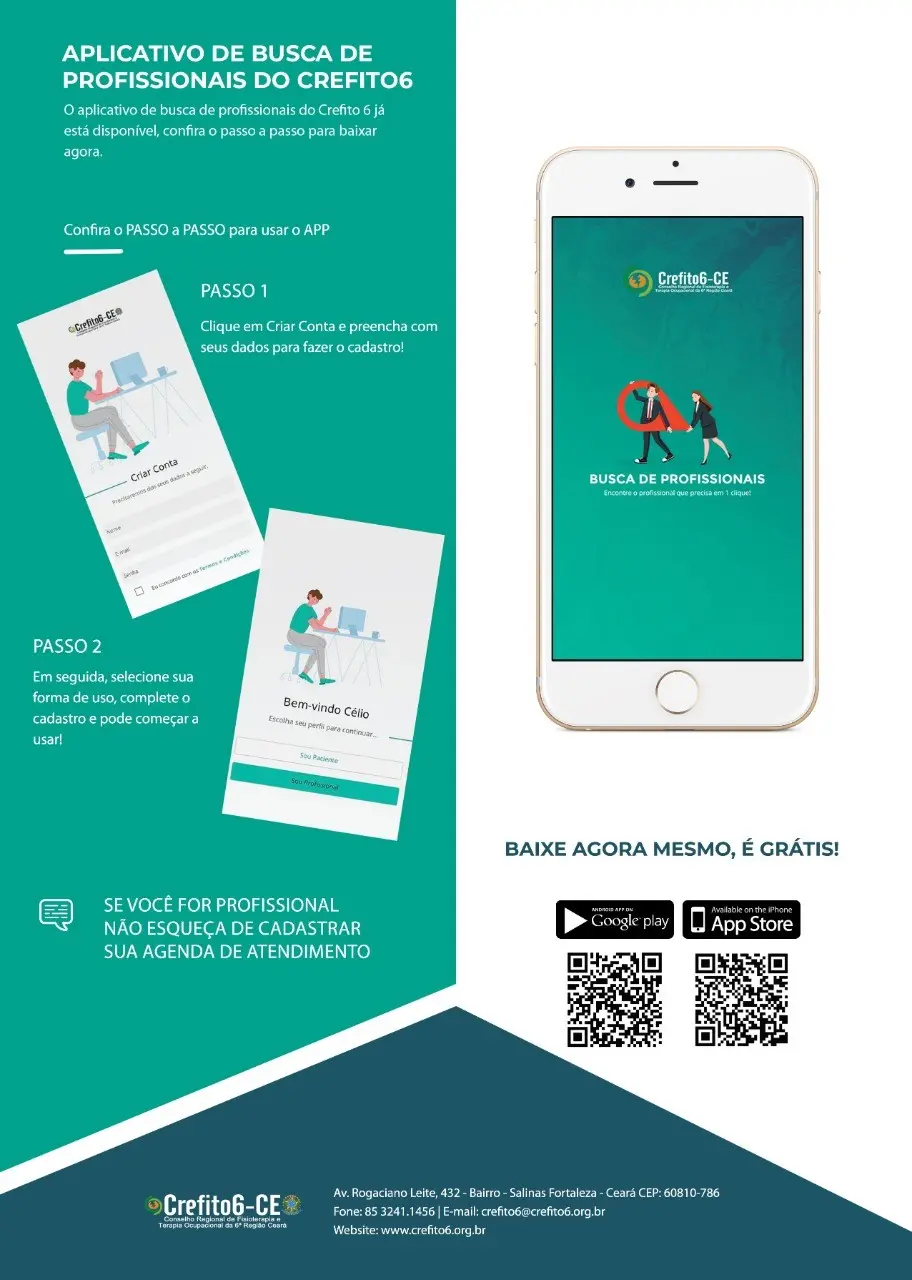 Em busca de ampliar o acesso da população a um serviço de saúde de boa qualidade, o Conselho Regional de Fisioterapia e Terapia Ocupacional da 6ª Região (Crefito6-CE) desenvolveu um aplicativo para conectar a sociedade com os profissionais. Intitulado Crefito 6, o app é o 1º da sua categoria no Brasil, e está disponível de forma gratuita para dispositivos Android e iOS.