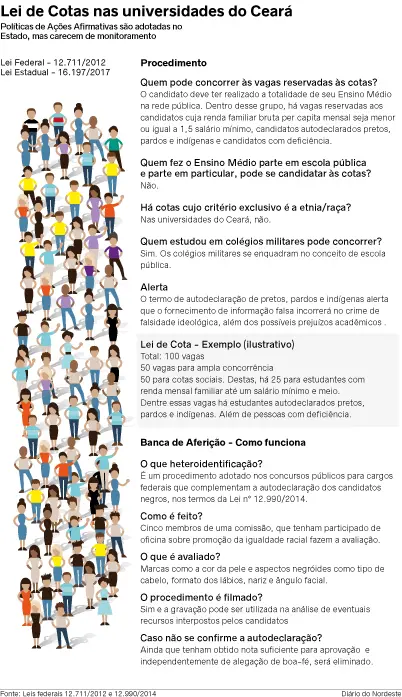No Ceará, nem a Universidade Federal (UFC), nem a Universidade Estadual (Uece) detêm instâncias do tipo e utilizam a autodeclaração de pretos, pardos e indígenas como critério preponderante. Na UFC, o sistema de cotas sociais - aquele que leva em conta a origem do estudante e a renda familiar bruta por pessoa - é adotado desde 2014. As cotas étnicos-raciais estão incluídas nesta dimensão com uma espécie de "subcota".