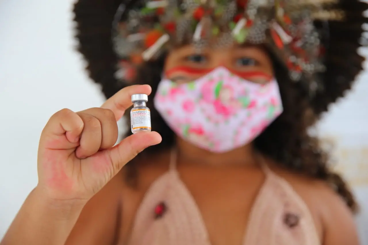 Crianças de 5 a 11 anos do povo Jenipapo-Kanindé, grupo indígena cearense localizado em Aquiraz, na Região Metropolitana de Fortaleza, começaram a ser vacinadas contra a Covid-19. Ao todo, 20 deles receberam a primeira dose pediátrica da Pfizer na manhã desta segunda-feira (24).