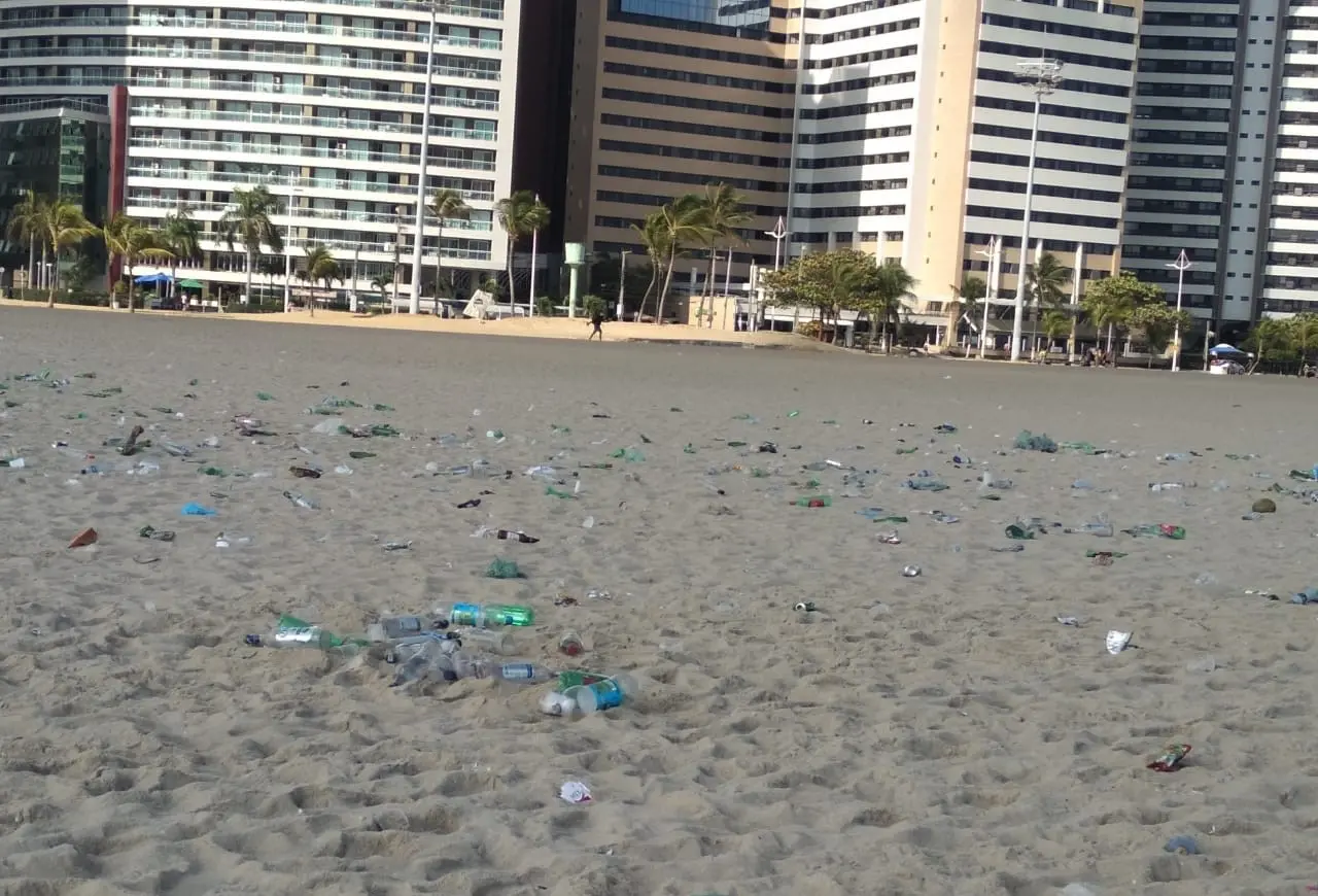 Próximo ao local da aglomeração, no Aterro da Praia de Iracema, o professor Keyson Gondim, morador do Bairro de Fátima registrou, com fotos e vídeos, o acúmulo de sujeira, sobretudo garrafas de plástico e vidro, na extensão da areia, por volta das 7h30 deste domingo (11).