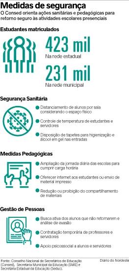 No cenário que desafia gestores da Educação em todo o País, o Conselho Nacional de Secretários de Educação (Consed) lançou, nesta semana, um guia com novos procedimentos sanitários e pedagógicos. Secretários da Educação de 13 estados brasileiros, com representante do Ceará, definiram que a reabertura das escolas deve considerar três fatores: infraestrutura e recursos, continuidade da aprendizagem e capacidade de análise da crise sanitária.