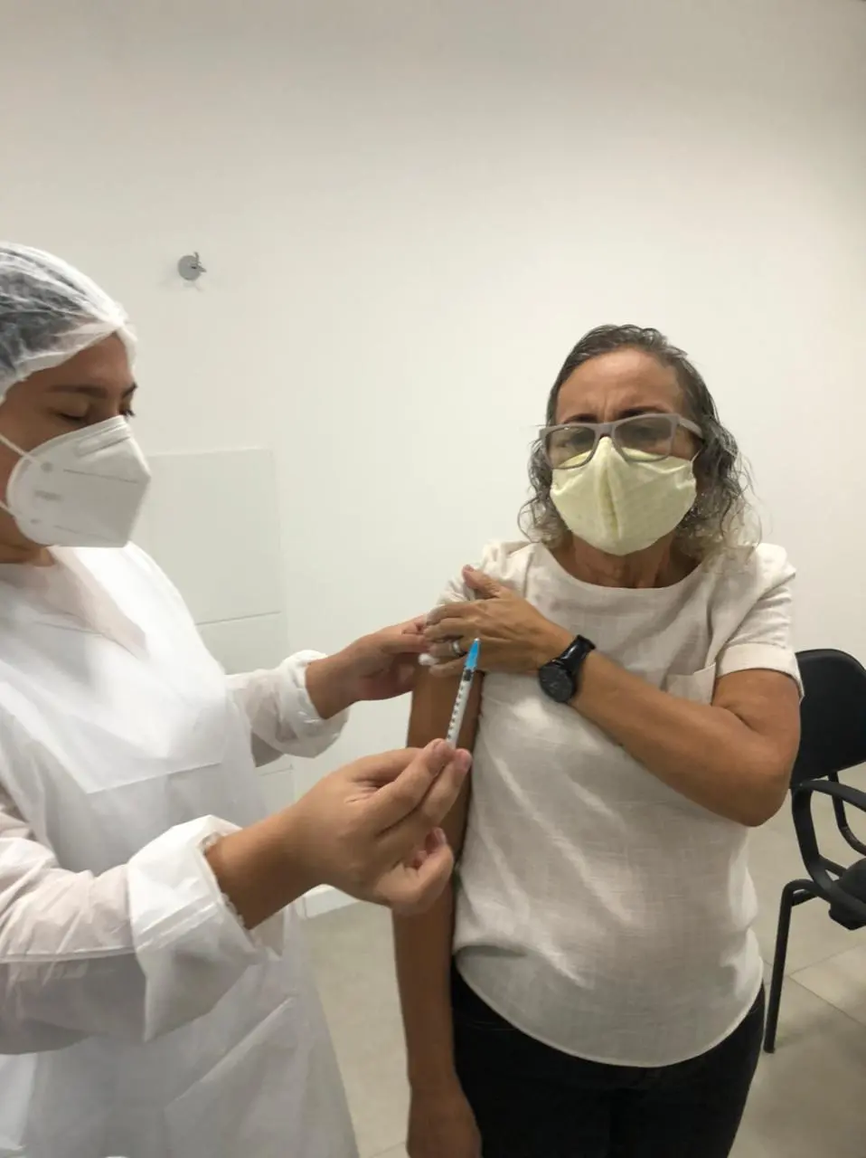 Hoje, 300 profissionais da educação básica residentes em Fortaleza foram agendados para se vacinar na Capital, conforme divulgou o prefeito Sarto Nogueira. Uma das contempladas foi a professora do ensino fundamental, Francisca Tonha Guerreiro Chaves, de 59 anos.