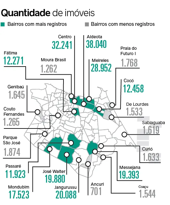 Conforme os dados, Fortaleza tem 871.689 imóveis contabilizados na Prefeitura, distribuídos nos 121 bairros. Desses, há conhecimento da idade de 84,8% e o Município cobra IPTU de 774.293 edificações.