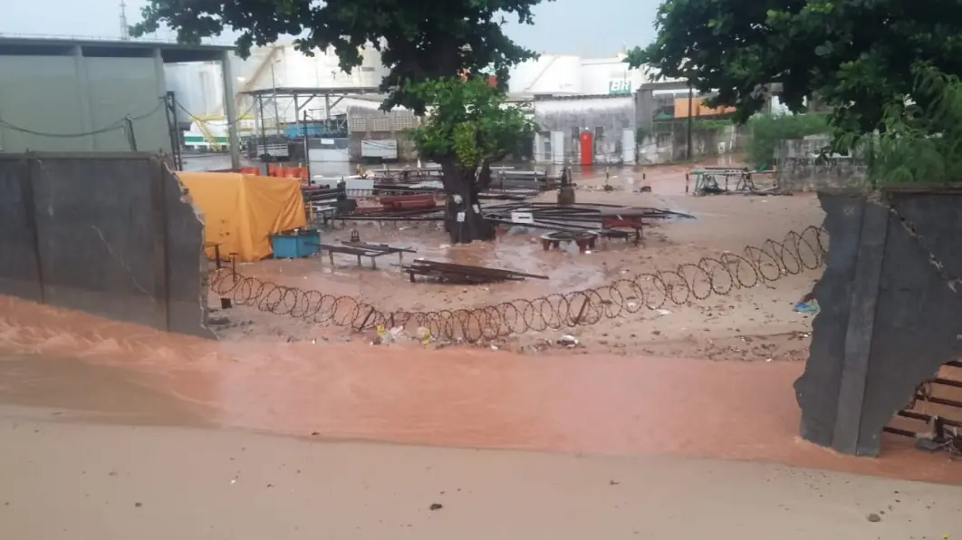 Na Avenida César Cals, no bairro Vicente Pinzón, o muro de uma unidade da Petrobras caiu devido a força da água da chuva.