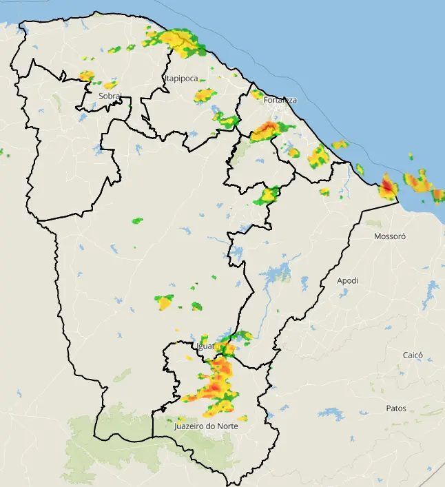 A Funceme também indica que as precipitações podem chegar às áreas Central, Sul e Oeste do Ceará durante o dia. Na faixa litorânea, no entanto, as chuvas se concentrarão somente na manhã.