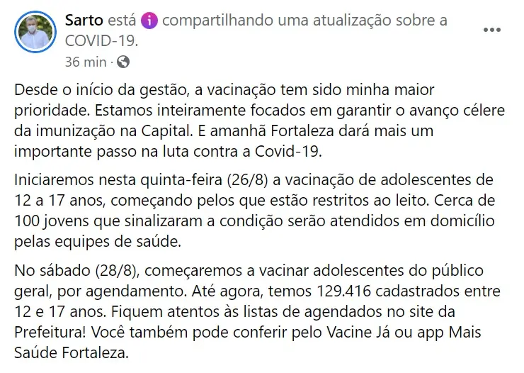 Ainda segundo publicação de Sarto, no sábado (28), Fortaleza irá vacinar adolescentes do público geral, por agendamento. "Até agora, temos 129.416 cadastrados entre 12 e 17 anos.