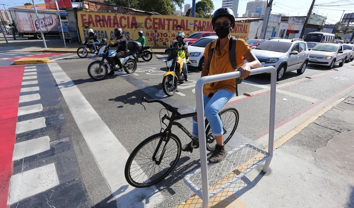 Como novo incentivo à mobilidade urbana, Fortaleza concluiu nesta quinta-feira (2) a implantação de 20 parapés em oito vias. Os equipamentos servem de suporte de pé e mão para ciclistas durante paradas em semáforos.