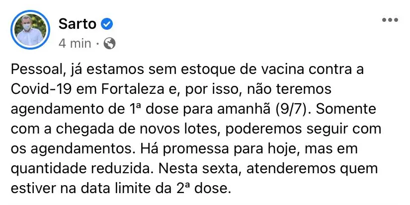 "Somente com a chegada de novos lotes, poderemos seguir com os agendamentos. Há promessa para hoje, mas em quantidade reduzida. Nesta sexta, atenderemos quem estiver na data limite da 2ª dose", escreveu o gestor em publicação no Twitter.