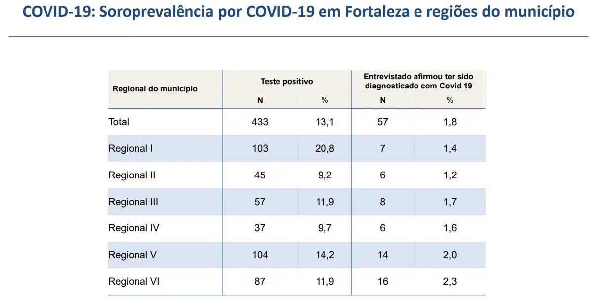 O índice de testes positivos para a infecção pelo novo coronavírus em Fortaleza é de 13,1% em relação ao número total de pessoas que participaram da segunda fase da pesquisa de soroprevalência realizada na capital cearense. O levantamento foi feito entre os dias 13 e 21 de julho, com 3.309 pessoas de 113 bairros de Fortaleza.