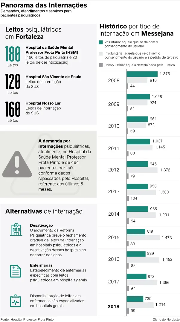 No Ceará, desde 1993, a extinção progressiva dos hospitais psiquiátricos é prevista em lei. Mas, Fortaleza, hoje, conta com 460 leitos em hospitais psiquiátricos especializados, enquanto, em hospitais gerais, há só dois leitos psiquiátricos ativos.