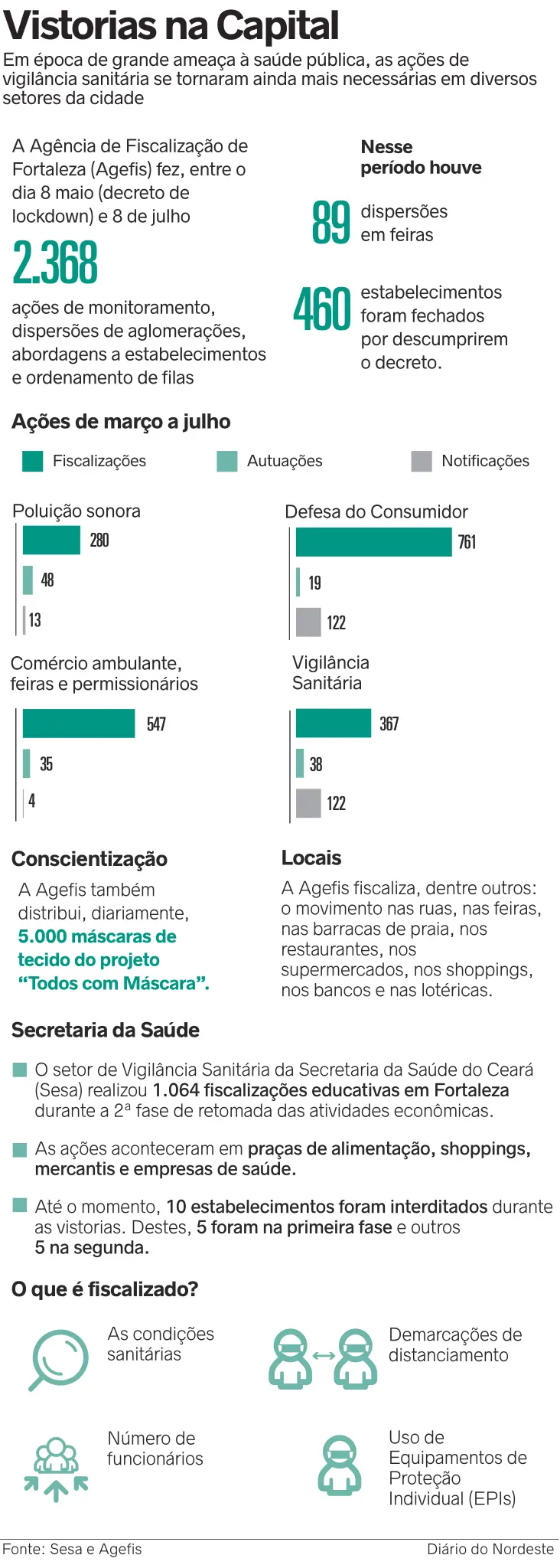 A pandemia no Ceará já contaminou mais de 131 mil pessoas e matou mais de 6.400 pacientes. E mesmo com o recuo dos índices em alguns territórios, segue fazendo vítimas. É um período difícil e assustador que, além dos desafios de garantir assistência hospitalar a quem precisa, tem ainda agravantes. A desobediência a regras sanitárias é um deles. Os evidentes estragos causados pela Covid-19 parecem não convencer parte da população. Em Fortaleza, entre maio (quando foi decretado lockdown) e julho (momento da terceira fase da reabertura econômica) foram realizadas, pelo menos, 3.432 ações de fiscalização tanto pela Agência de Fiscalização de Fortaleza (Agefis), como pela Vigilância Sanitária do Estado, para, dentre outros, dispersar aglomerações, ordenar filas e vistoriar estabelecimentos.