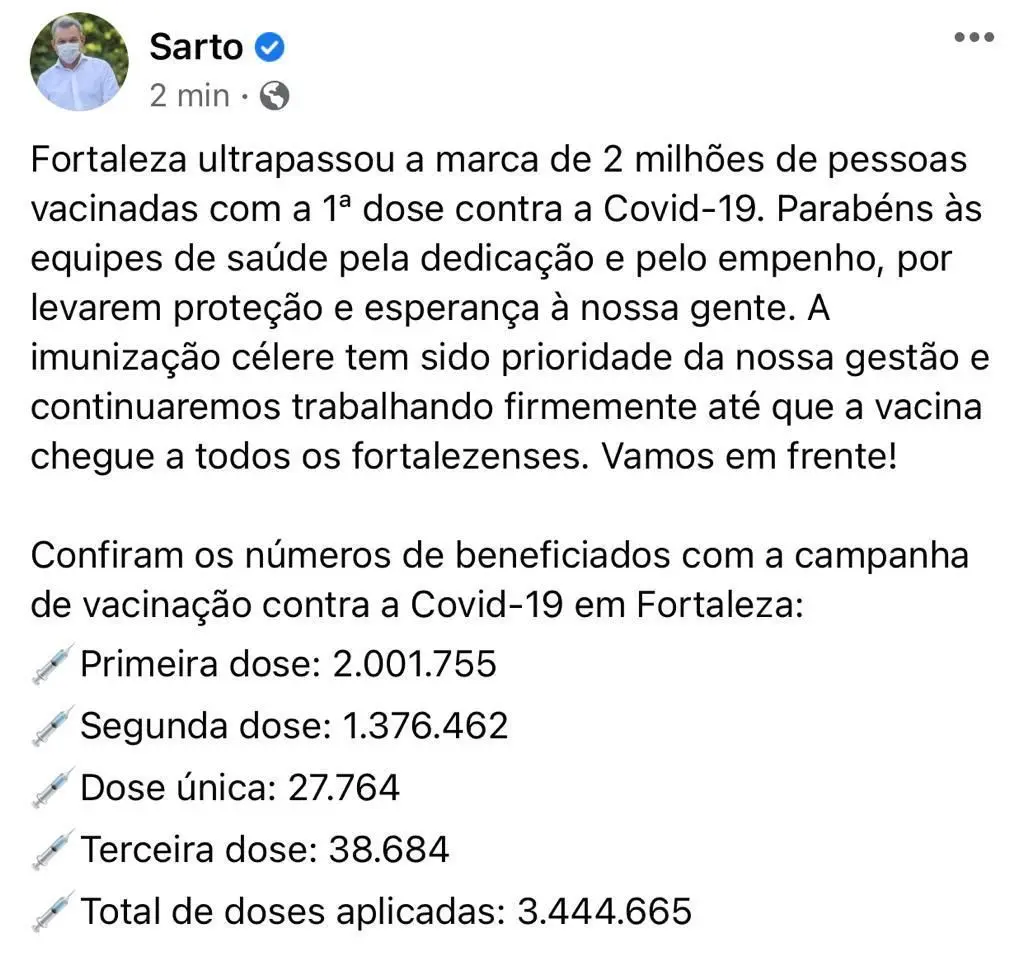"Parabéns às equipes de saúde pela dedicação e pelo empenho, por levarem proteção e esperança à nossa gente", pontuou Sarto na mesma postagem. Além disso, o prefeito reforçou que a rapidez do processo de imunização tem sido prioridade para encerrar a pandemia em solo cearense.