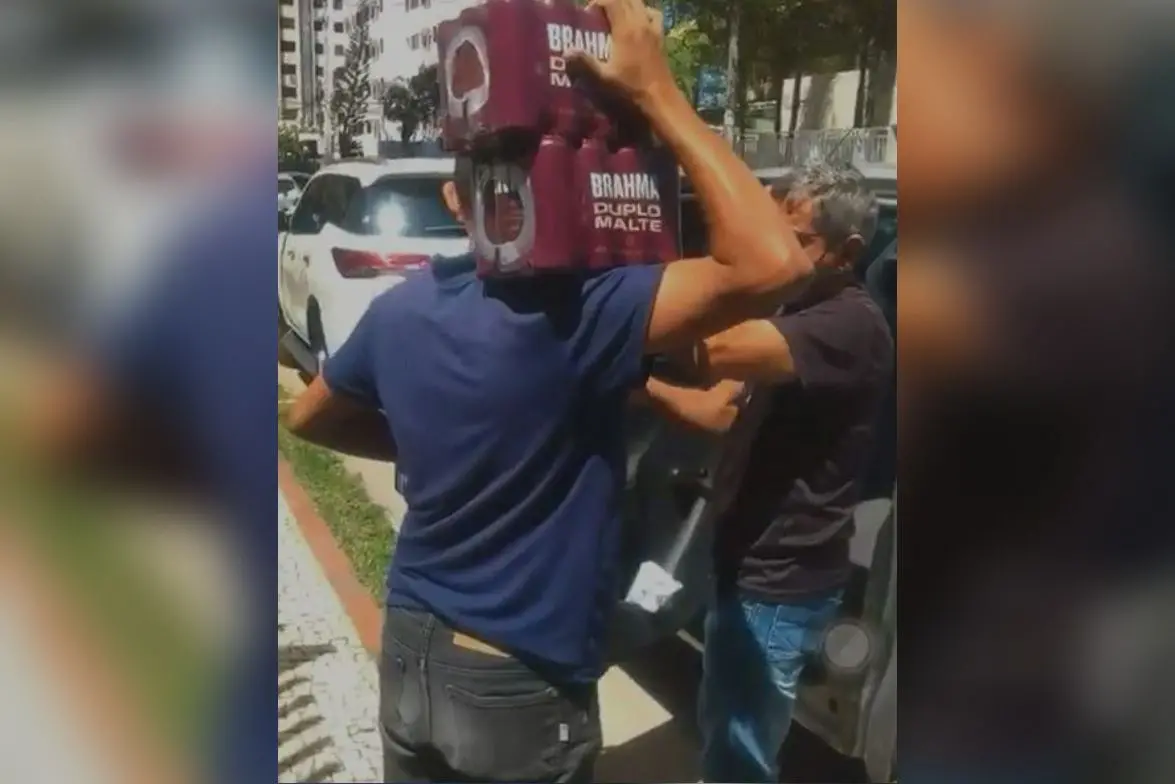 Uma testemunha registrou em vídeo o momento em que ele retira os fardos com latas de cerveja da parte de trás do veículo adesivado com o emblema do Governo e os entrega a um ajudante.