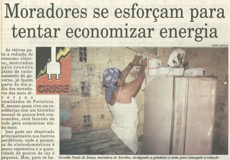 Em junho de 2001, a dona de casa Geralda Paula de Sousa fazia malabarismos para economizar energia no bairro Serviluz: sua casa tinha apenas três lâmpadas, e os aparelhos se resumiam à geladeira e à televisão. Segundo ela, toda a família acolheu a ordem de “apagar geral”.