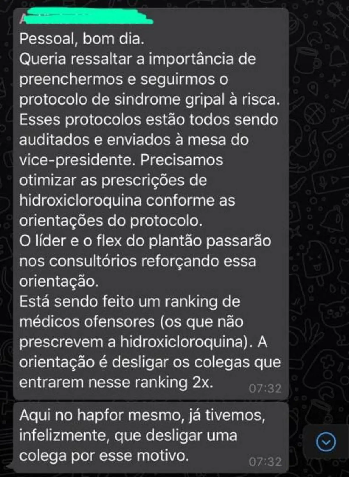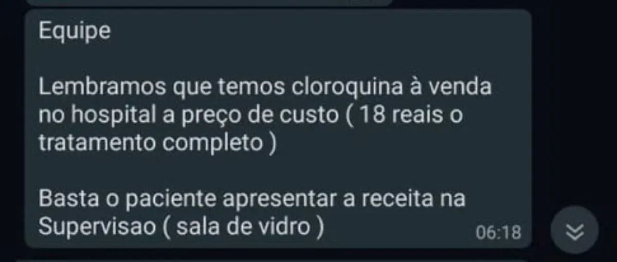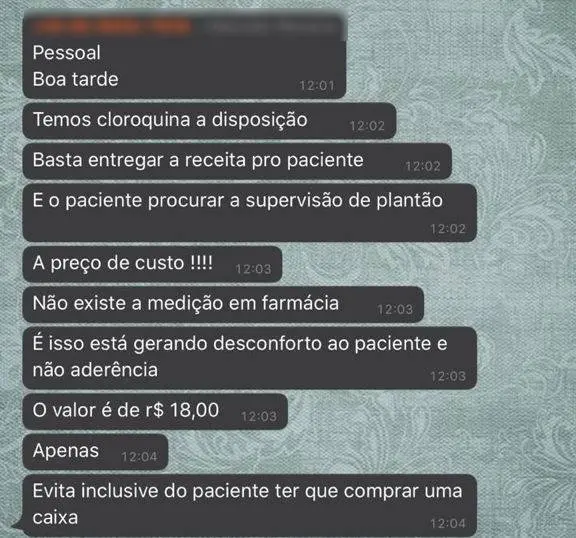 No período citado, Felipe Nobre também relatou que o chefe de uma unidade de saúde da rede afirmou, em um grupo de mensagens interno no WhatsApp, que "não cabe discussão sobre a hidroxicloroquina", orientando aos profissionais subordinados a pararem de informar sobre os possíveis riscos da medicação.