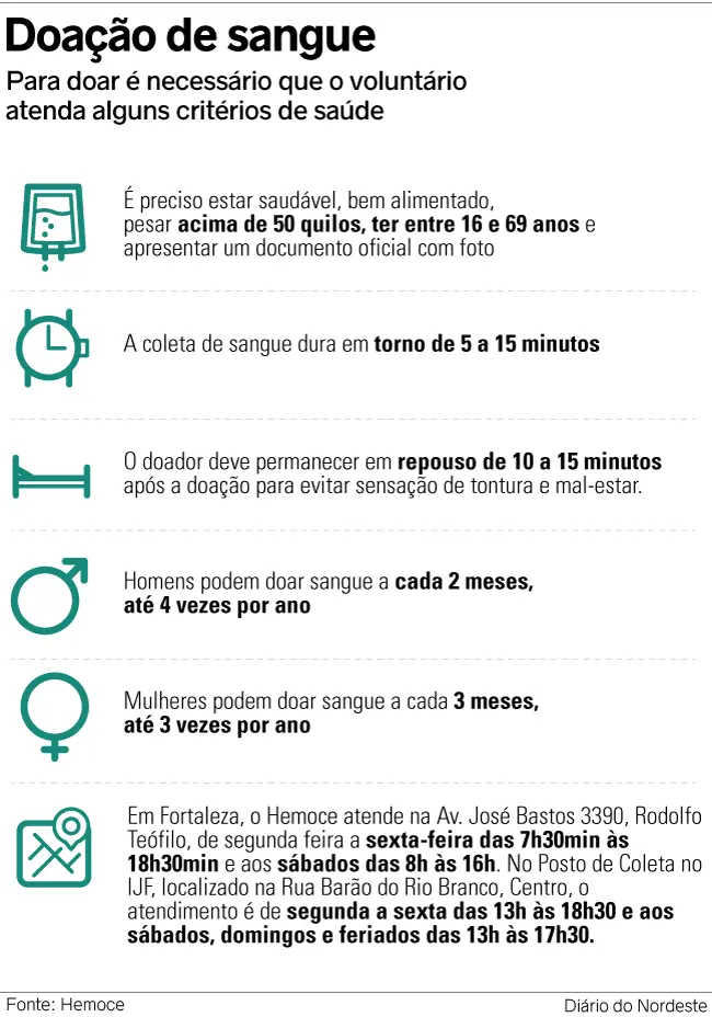 Para ser um doador, é preciso estar saudável, bem alimentado, pesar mais de 50kg, ter entre 16 e 69 anos de idade e apresentar um documento de identificação oficial e com foto. Conforme a assistente social do Hemoce Alessandra Moraes, após o cadastro na instituição, é preciso passar por uma triagem, na qual são avaliadas as condições de saúde. Após a doação, são realizados exames laboratoriais para análise da amostra, além da identificação do fator RH, quando são feitas pesquisas de anticorpos irregulares.
