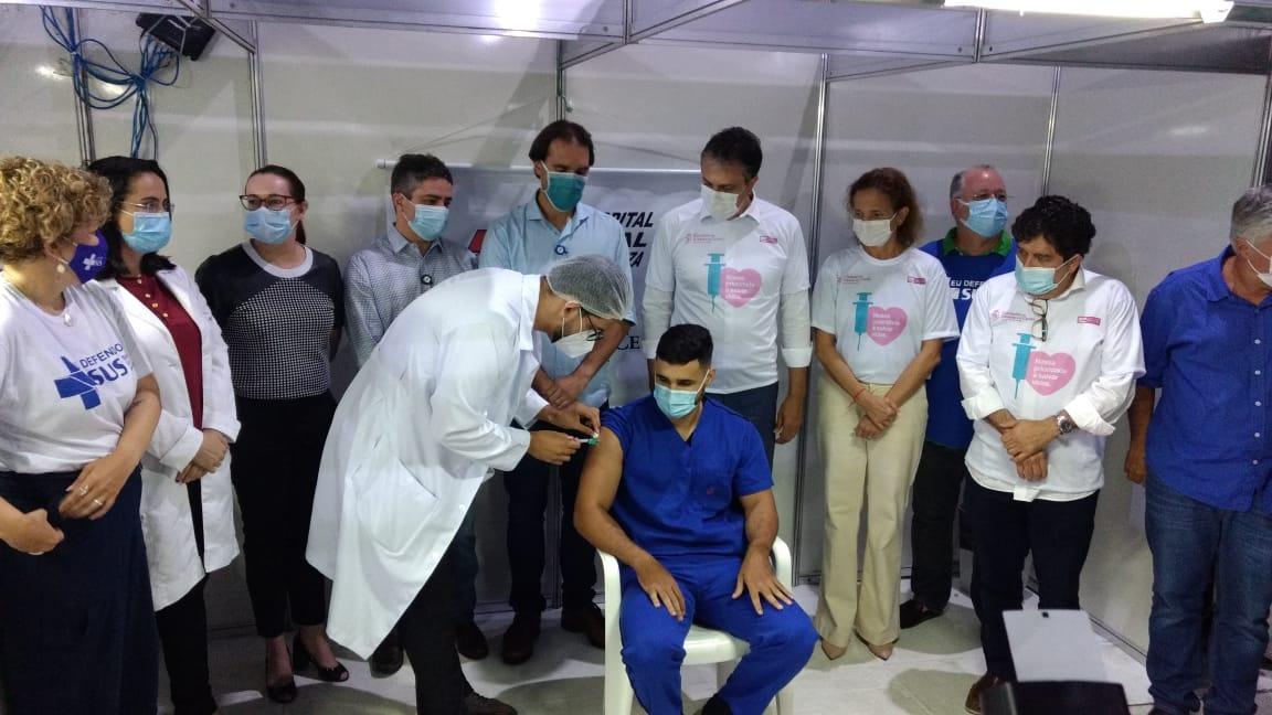 Profissionais do Instituto Doutor José Frota (IJF) e do Hospital Geral de Fortaleza (HGF) receberam doses da vacina contra a Covid-19 nesta segunda-feira (18). A imunização nas instituições ocorreu logo após os seis primeiros cearenses serem vacinados no Estado durante solenidade no Hospital Leonardo da Vinci. Foram vacinados cinco profissionais de cada unidade.