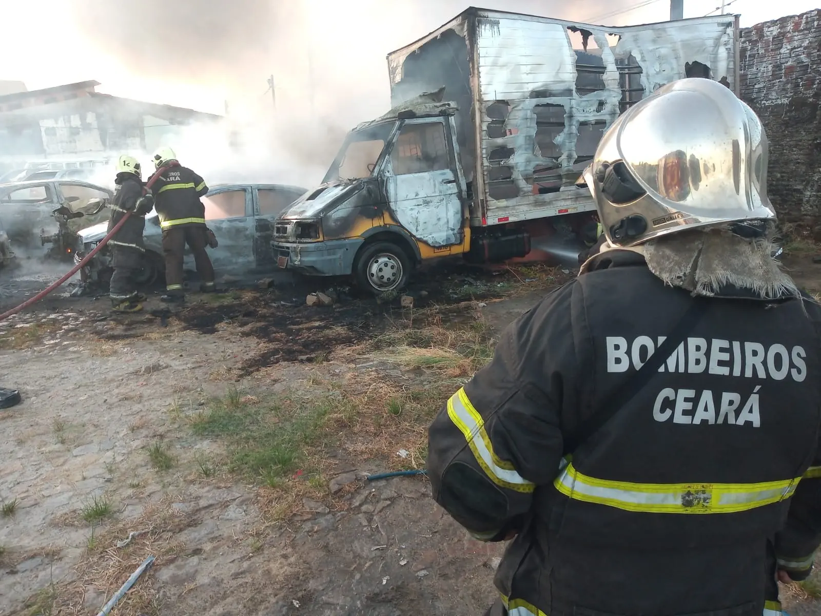 Um incêndio atingiu dez carros que estavam em um estacionamento de uma empresa de transportes localizada na BR-116, no bairro Cajazeiras, em Fortaleza, na tarde desta terça-feira (23). Ninguém se feriu.