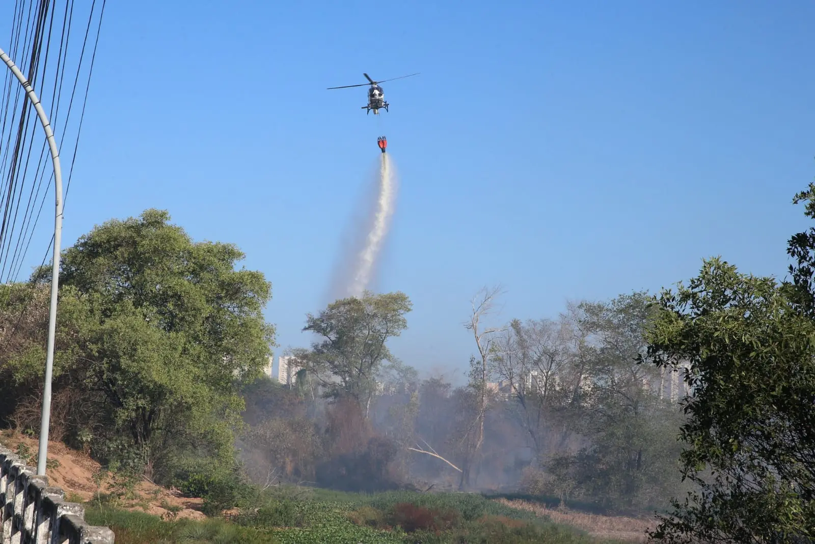 Os brigadistas foram até pontos estratégicos do incêndio para montar um cinturão ou aceiro, uma técnica que retira o combustível natural do fogo, limpa o capim seco e deixa uma área em terra batida. A velocidade do fogo, assim, é cortada devido às correntes de ar da região.