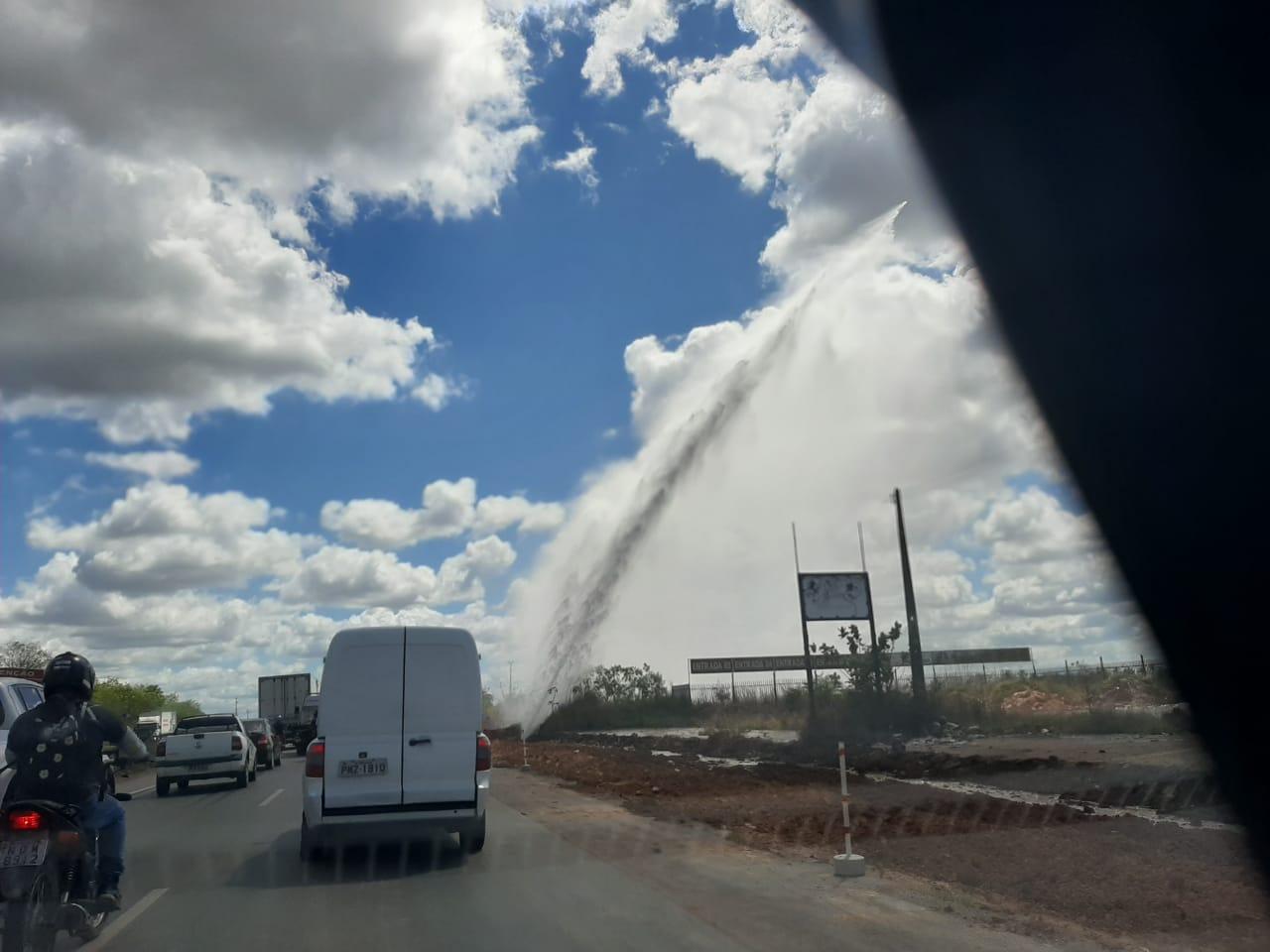 Um vazamento em uma tubulação da Companhia de Água e Esgoto do Ceará (Cagece) provocou a formação de um forte jato d'água às margens do 4º Anel Viário, na Grande Fortaleza, nesta quinta-feira (16). A Companhia informou, por volta de 16h30, que uma equipe foi enviada ao local, e o trabalho de reparo deve ser concluído até as 18h.
