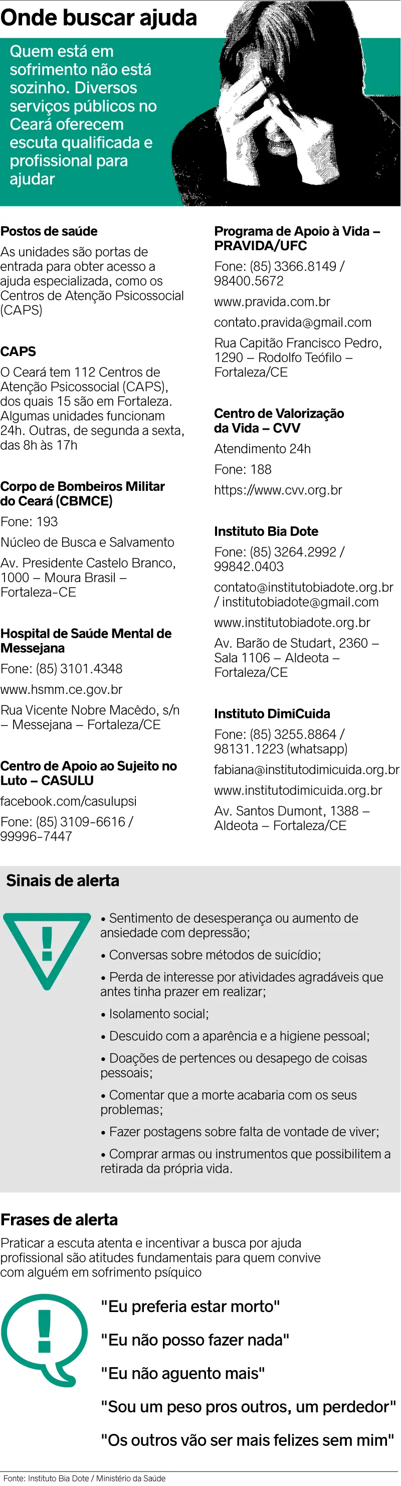 Vládia Jucá, professora do Departamento de Psicologia da Universidade Federal do Ceará (UFC), reconhece a importância de iniciativas como o CVV, mas ressalta que é preciso cuidar de quem atende. “Para a pessoa lidar com uma situação tão mobilizadora, escutar o outro com a angústia a flor da pele, é preciso se cuidar. É fundamental que ela também tenha espaços para compartilhar tanto o próprio sofrimento como conversar sobre os atendimentos que faz. Cuidador do cuidador é essencial”, frisa.