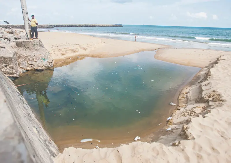 Em plena Avenida Beira-Mar, principal cartão-postal da cidade, fortalezenses e turistas são surpreendidos com uma mancha de esgoto que sai de uma galeria de água pluvial, na altura da Avenida Barão de Studart, e deságua no mar. A poluição, visível a quem passa, prejudica a biodiversidade marinha e põe em risco os desavisados que se arriscam em um banho de mar.