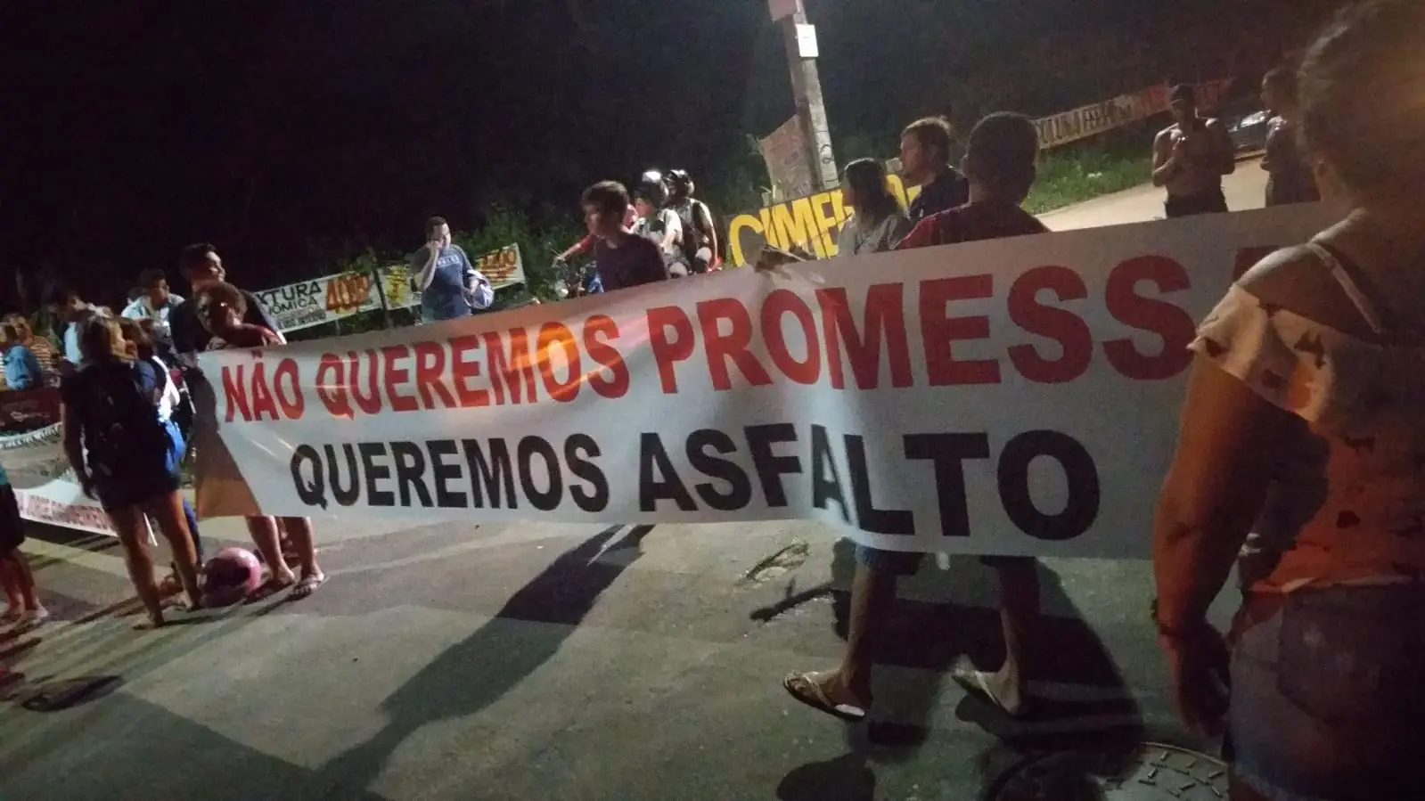 Portando faixas em protesto, os manifestantes pediam melhorias para o bairro, como o saneamento básico das ruas. Segundo eles, o problema já existe há, pelo menos, três anos.