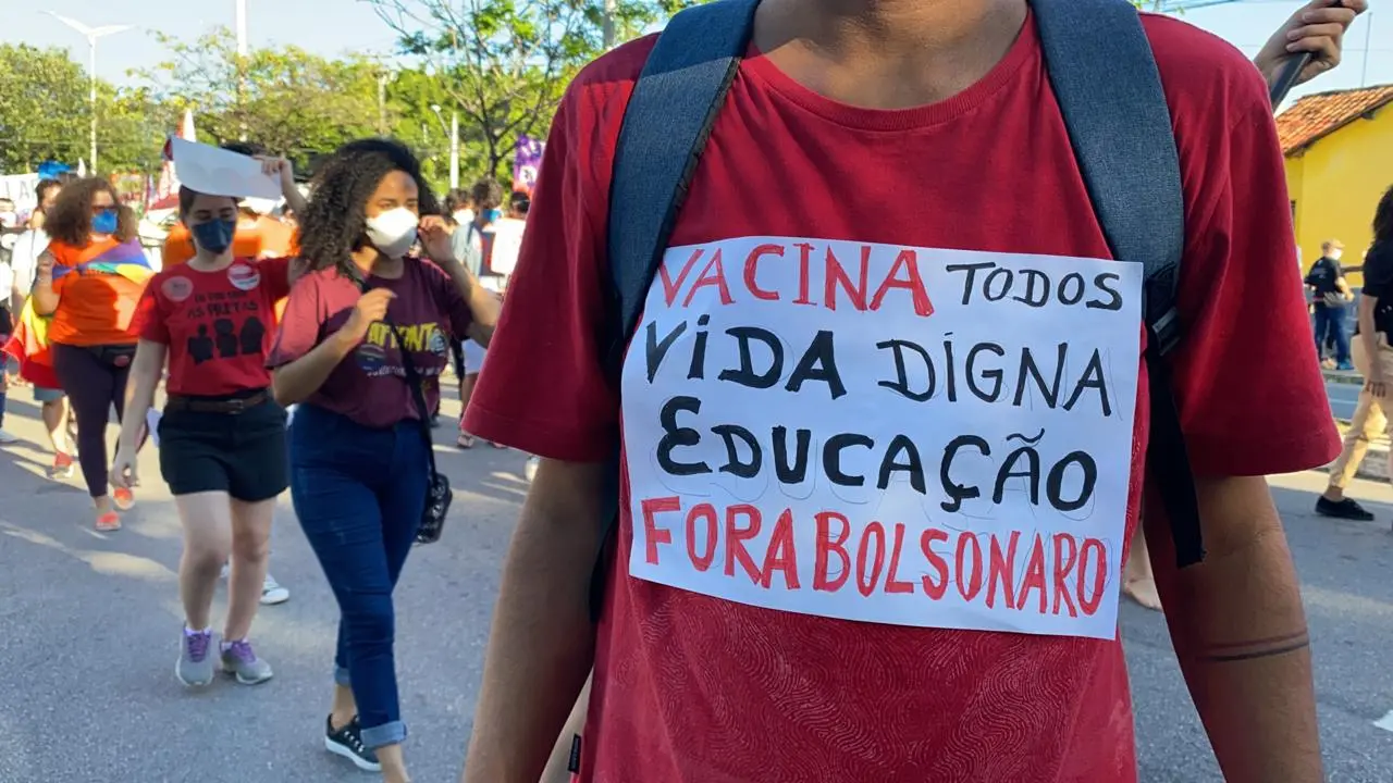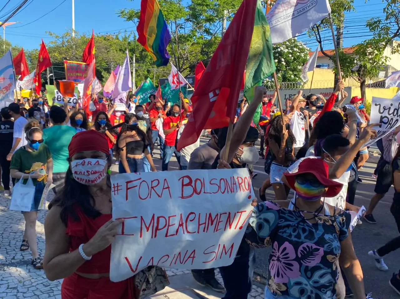 Além de Fortaleza, também foram realizados atos contra o presidente Jair Bolsonaro em Brasília e mais 21 capitais neste sábado. Em todos as manifestações, os participantes pediam mais vacina, a saída de Bolsonaro, auxílio emergencial de R$ 600, entre outras pautas.