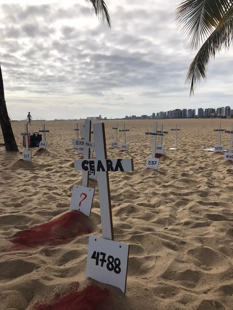 Cruzes espalhadas pela areia da Praia de Iracema, estampando nomes dos estados e o número de vítimas da Covid-19. Foram elas os símbolos do protesto de médicos cearenses do Coletivo Rebento, na manhã deste sábado (13), em Fortaleza, em apoio às famílias das vítimas da pandemia, aos profissionais de saúde, que estão na linha de frente contra o novo coronavírus, e em repúdio às ações do Governo Federal diante da crise na saúde.