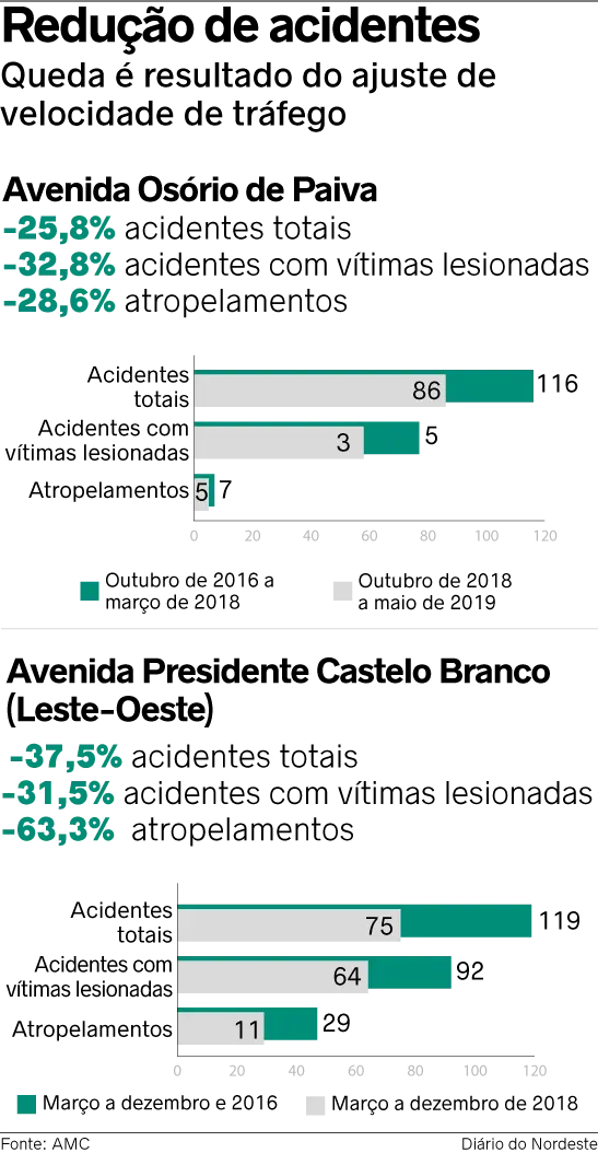 Com as mudanças, o órgão espera obter o mesmo êxito de outros trechos que já adotaram as medidas, a exemplo da Avenida Leste-Oeste, entre o Pirambu e a Barra do Ceará, que reduziu demodo significativo as ocorrências de trânsito. Se entre outubro de 2016 e março do ano passado 119 acidentes foram contabilizados, oito meses depois, o quantitativo decresceu para 75, uma queda de 37,5%. Já o número de acidentes com vítimas lesionadas foi de 92 a 64, enquanto o de atropelamentos passou de 29 para 11, caindo 63,3%.